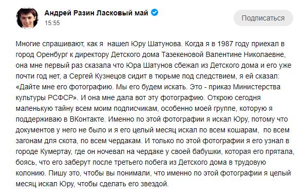 Ля-ля-фа, я не разделяю пиар методы Разина. В творчестве я ценю творчество, а не пиар. Но методы Разина всегда имели результат. Он 35 лет назад придумывал небылицы и сейчас их придумывает, и как ни странно, но это работает. Шатунову создан образ сироты, его нужно жалеть. Разин не заслужил ненависти. Ненавидеть его могут только неумные люди. В 2019 году Кудряшов сказал своим фанаткам команду "фас", и они набросились на Разина. И до сих пор Юрочку всем жаль, его окружали негодяй Разин, жадный директор Аркаша и даже жена оказалась "недостойной" Юры. В общем, вокруг одни негодяи, а Юра - Бог. Это сработало. И Разин к этому имеет самое прямое отношение. А ещё я верю в то, что Шатунов жив, а похороны инсценировка. Возможно, Разин запланировал это лет 20 назад, а воплотили сейчас. 26.10.23 18:06